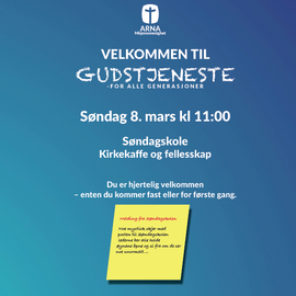 VELKOMMEN TIL GUDSTJENESTE-FOR ALLE GENERASJONER Søndagskole Kirkekaffe og fellesskap...